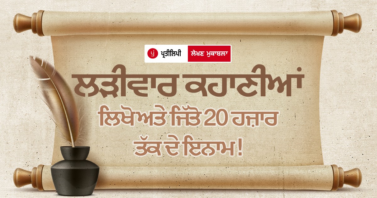 ਪ੍ਰਤੀਲਿਪੀ ਤੁਹਾਡੇ ਲਈ 'ਲੜੀਵਾਰ ਕਹਾਣੀਆਂ' ਲੇਖਣ ਮੁਕਾਬਲਾ ਲੈ ਕੇ ਹਾਜ਼ਿਰ ਹੈ। ਪ੍ਰਤੀਲਿਪੀ ਵੱਲੋਂ ਤੁਹਾਡੇ ਲਈ ਇਹ ਮੁਕਾਬਲਾ ਪ੍ਰਤੀਲਿਪੀ 'ਤੇ ਗੋਲਡਨ ਬੈਜ ਪ੍ਰਾਪਤ ਦੇ ਨਾਲ-ਨਾਲ ਆਪਣੀਆਂ ਰਚਨਾਵਾਂ ਤੋਂ ਆਮਦਨੀ ਕਮਾਉਣ ਅਤੇ ਵੱਧ ਤੋਂ ਵੱਧ ਪਾਠਕ/ਫੋਲੋਅਰਸ ਪ੍ਰਾਪਤ ਕਰਨ ਦੇ ਹਵਾਲੇ ਨਾਲ ਲੌਂਚ ਕੀਤਾ ਗਿਆ ਹੈ। ਤੁਸੀਂ ਵੀ ਇਸ ਮੁਕਾਬਲੇ ਦੇ ਤਹਿਤ ਆਪਣੀਆਂ ਰਚਨਾਵਾਂ ਪ੍ਰਕਾਸ਼ਿਤ ਕਰਕੇ ਇਹ ਸਾਰੇ ਲਾਭ ਉਠਾ ਸਕਦੇ ਹੋ ਅਤੇ ਆਕਰਸ਼ਕ ਇਨਾਮ ਵੀ ਜਿੱਤ ਸਕਦੇ ਹੋ।